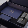 | Thiết kế sang trọng | Bút thân đen – viền Chrome, sổ da và ví da navy đồng bộ, mang vẻ đẹp hiện đại và tinh tế. |