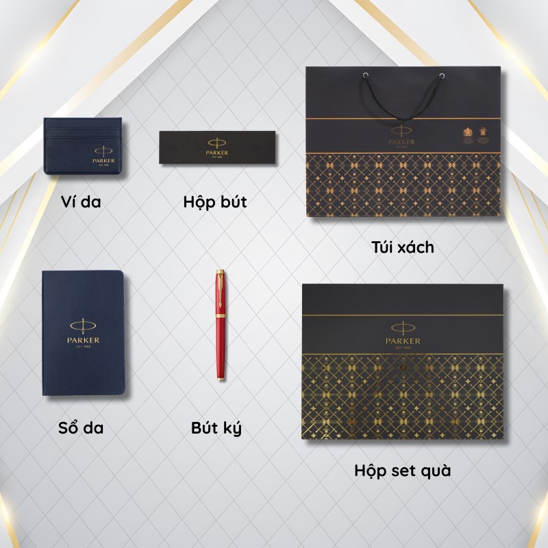 Bộ Giftset tại Wiix gồm: bút bi ký tên Parker IM PRM X Red GT, sổ da, ví da, hộp bút, hộp set quà và túi xách Parker đồng bộ – mở hộp là tặng ngay. Wiix miễn phí khắc tên lên sản phẩm để cá nhân hóa món quà.