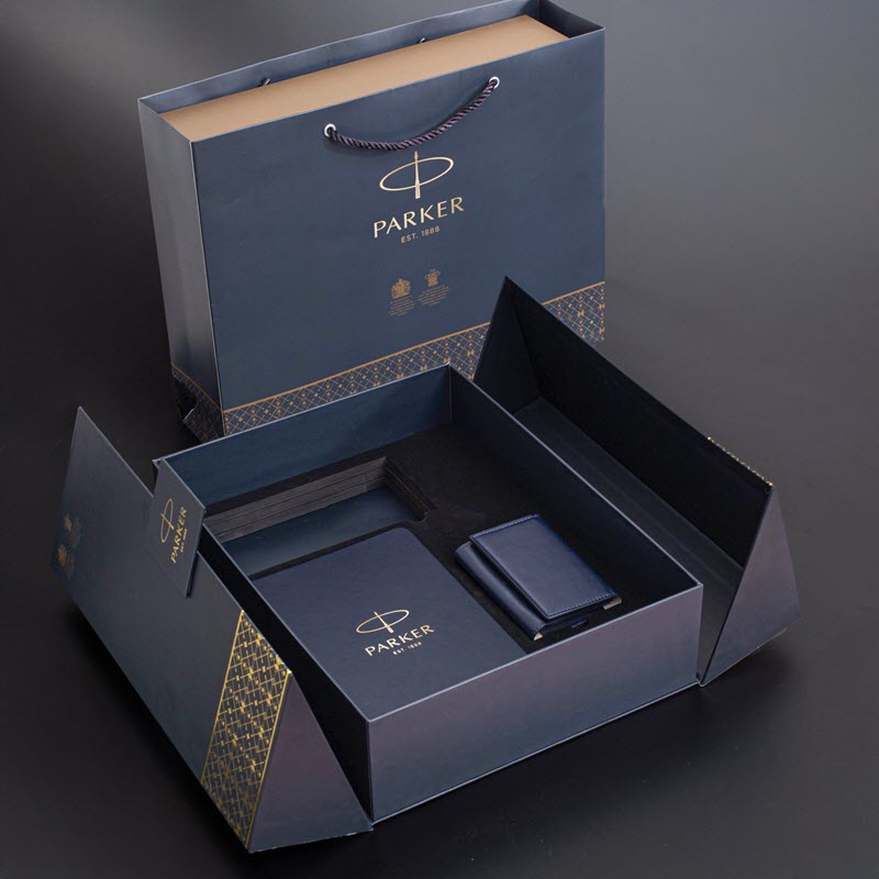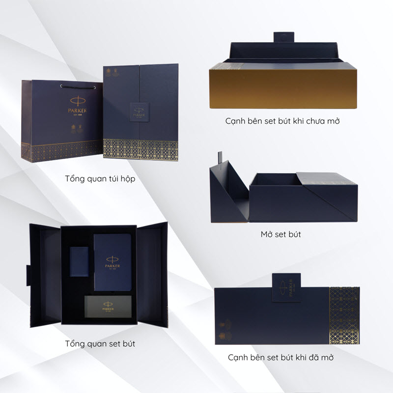 Một bộ quà tặng Parker không thể thiếu hộp hãng và túi giấy chính hãng – yếu tố thể hiện sự chỉnh chu và đẳng cấp khi trao tặng. Hộp hãng được làm bằng chất liệu cao cấp, logo Parker in hoặc dập nổi rõ ràng. Bên trong lót lớp nhung hoặc da mịn giúp nâng tầm giá trị bộ quà, đồng thời bảo vệ bút trong suốt quá trình vận chuyển. Túi giấy thiết kế trang trọng, tông màu nhã nhặn, phối hợp hoàn hảo với hộp. Người mua không cần gói quà thêm, có thể trao tặng trực tiếp.