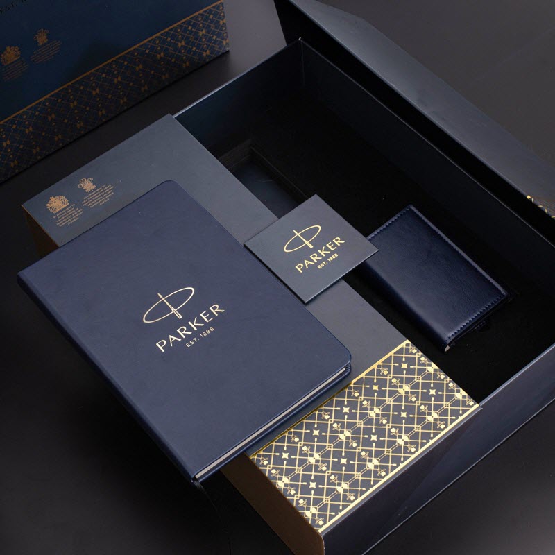 Ngoài ra, giftset Parker còn được đầu tư kỹ lưỡng vào phần bao bì. Hộp quà được thiết kế dạng hộp cứng, màu sắc trang nhã, logo Parker in nổi tạo cảm giác sang trọng ngay khi mở nắp. Bên trong hộp được chia khoang rõ ràng để cố định bút, sổ và ví, giúp sản phẩm luôn gọn gàng và được bảo vệ tốt khi vận chuyển.
